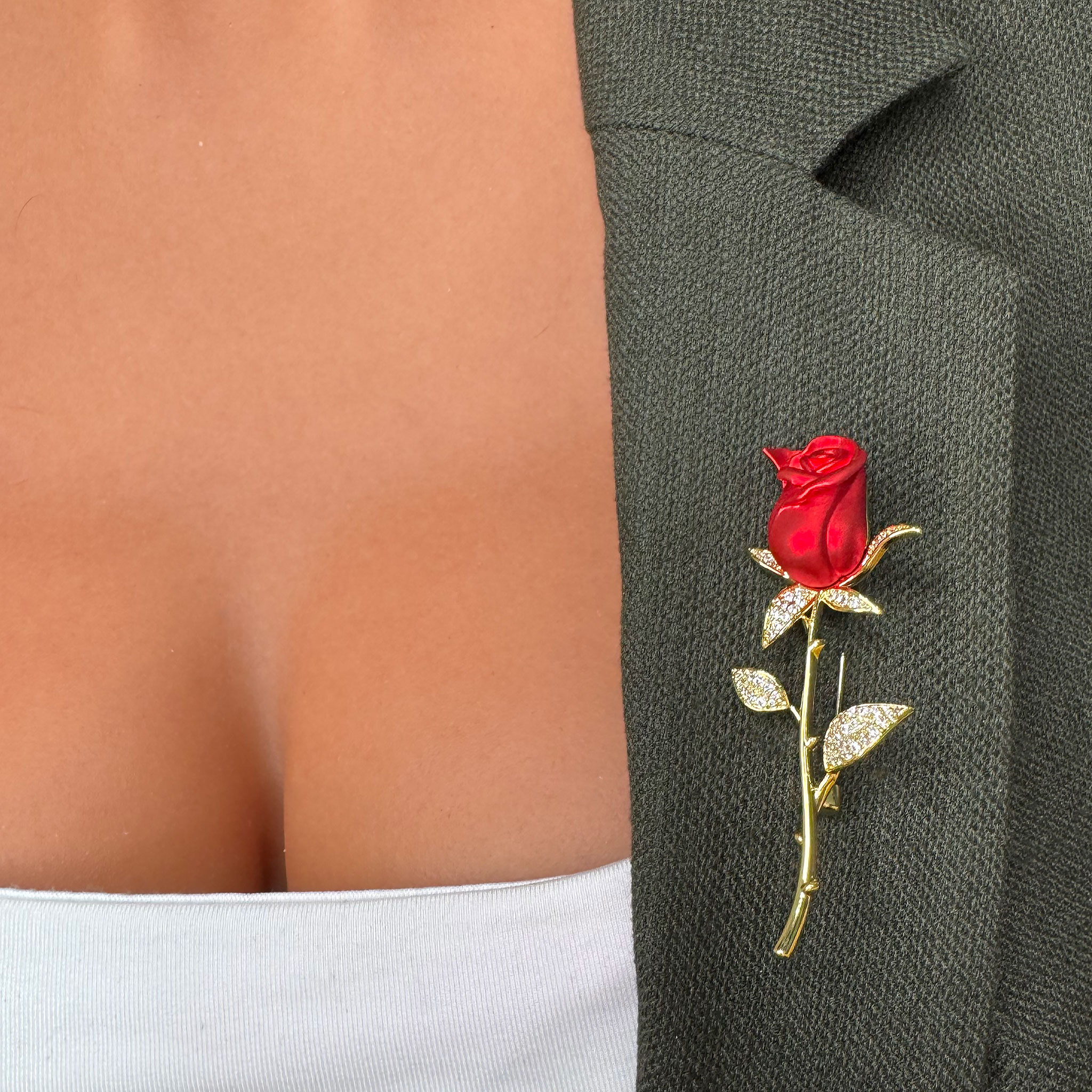 Broșa în formă de trandafir roșu adaugă eleganță, feminitate și un strop de romantism ținutelor tale, fiind un accesoriu ideal pentru primăvară.