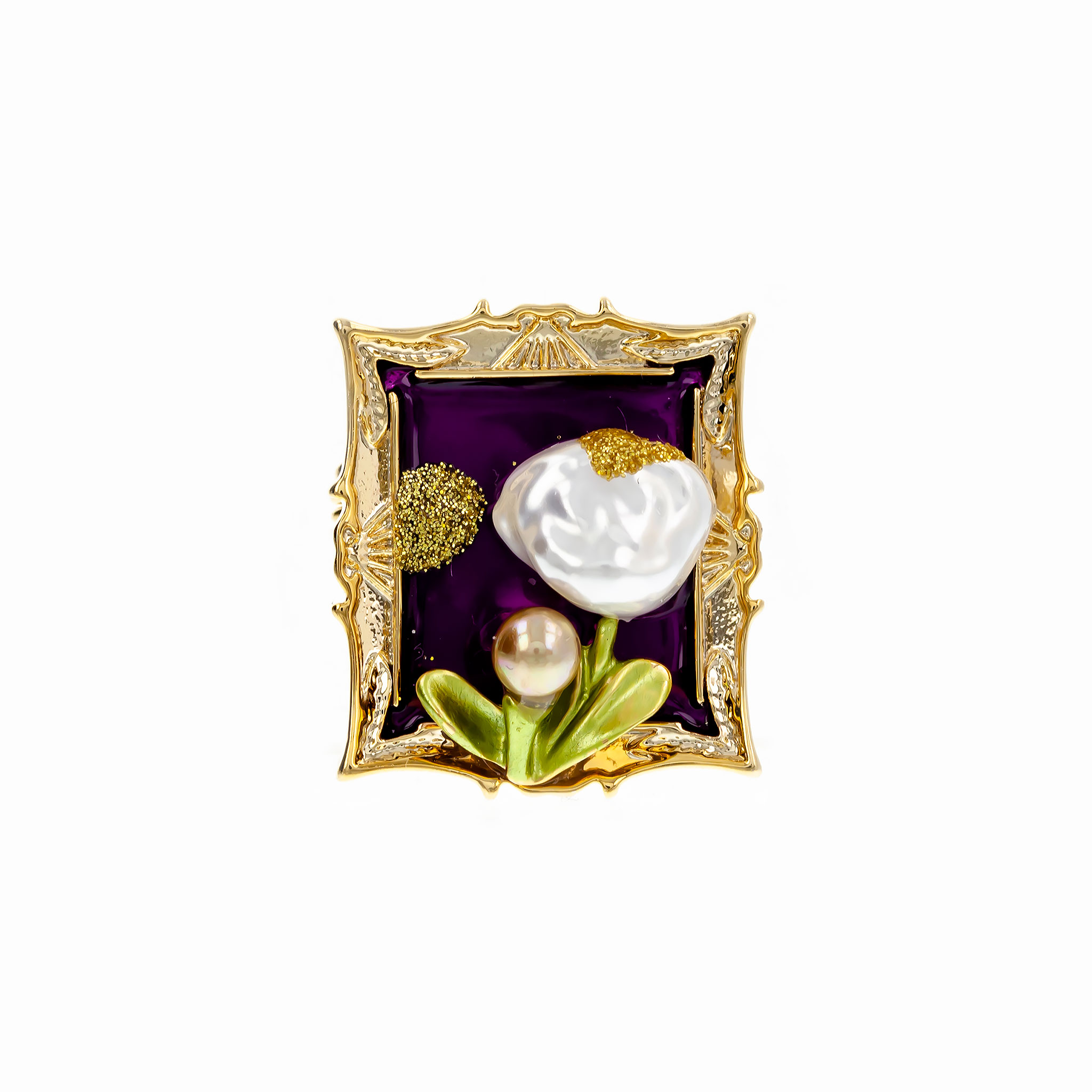 Această broșă cu ramă mov și floricele evocă frumusețea primăverii, adăugând un detaliu subtil, dar plin de rafinament în orice apariție.