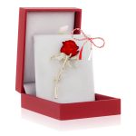 - Broșă Premium Gold Plated Trandafir Roșu cu Pietricele Hand-Made, șnur Marțișor alb-roșu, ambalată pe suport pentru broșă și casetă, însoțită de pungă cadou și plic roșu pentru mesaj, pregătită cu grijă astfel încât să devină un cadou memorabil.