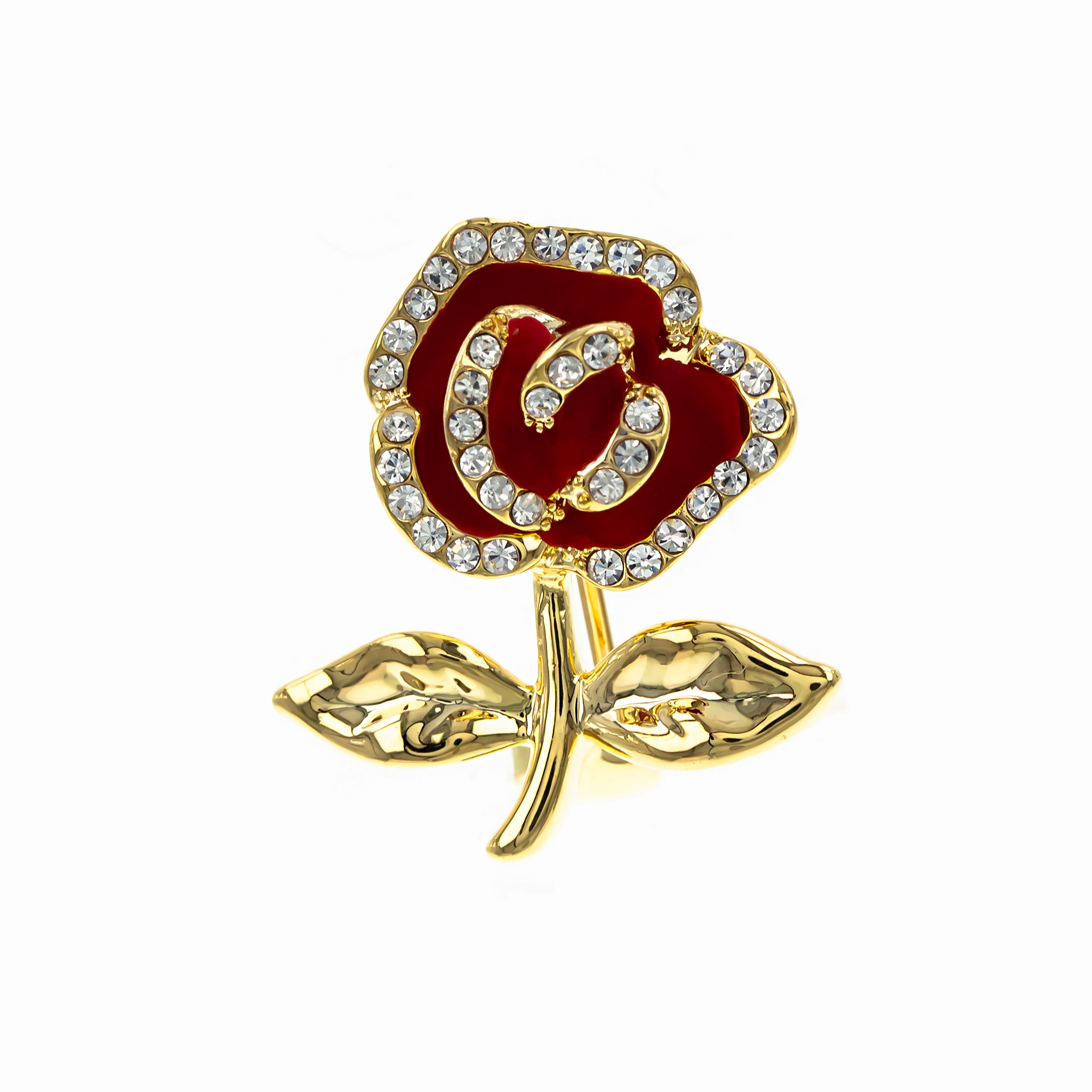 Broșa placată cu aur în formă de trandafir roșu decorat cu pietre de zirconiu și frunzulițe este o bijuterie de o frumusețe sublimă, care emană o aură de pasiune, eleganță și strălucire. Această broșă aduce cu sine simboluri ale iubirii și ale naturii, subliniate prin combinația dintre trandafir, pietre de zirconiu și frunzulițe.
