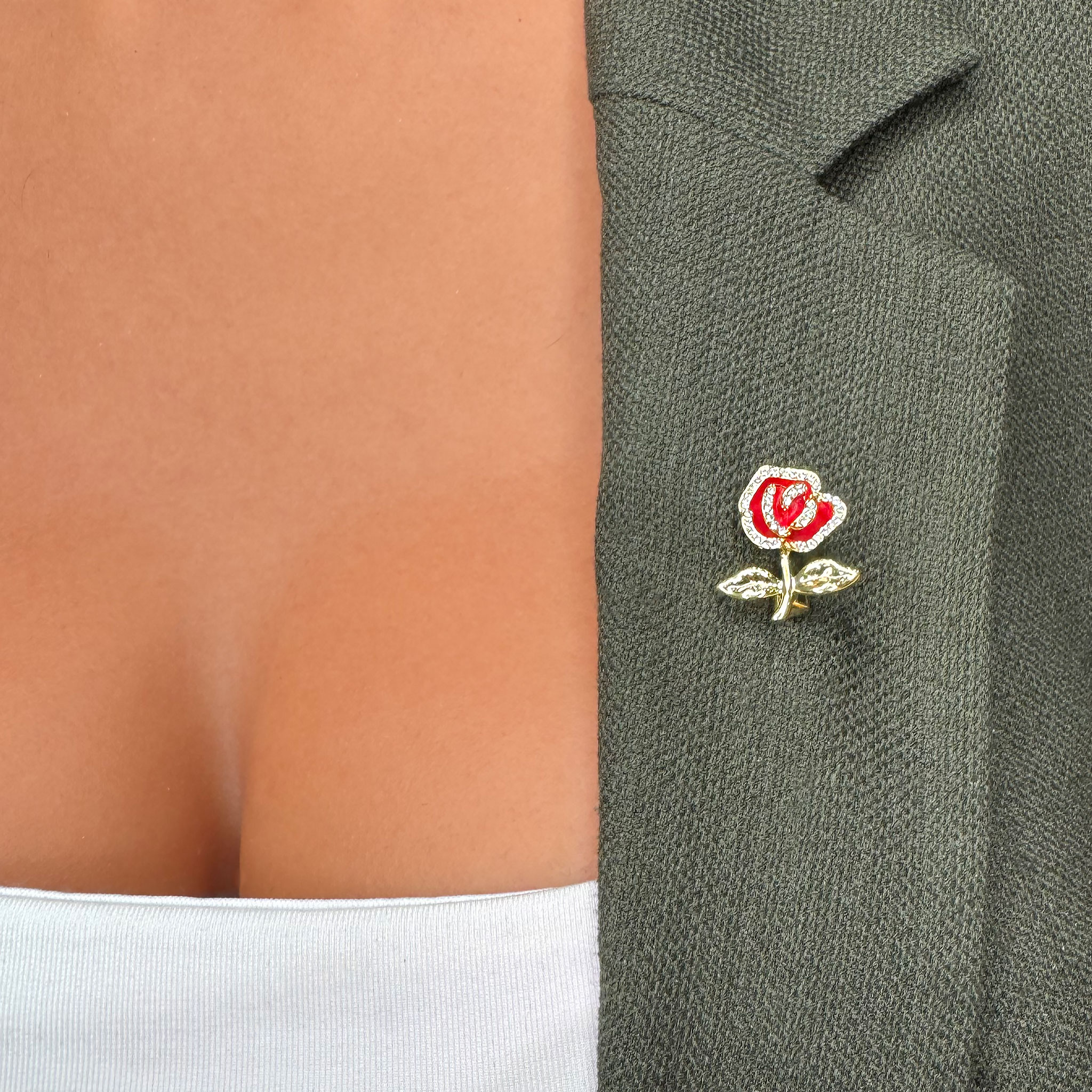 Forma trandafirului roșu sugerează pasiunea și iubirea. Detaliile fine ale petalelor trandafirului completează cu grație designul bijuteriei, accentuând rafinamentul și eleganța. Pietrele de zirconiu adaugă o notă de strălucire și eleganță bijuteriei. Ele completează cu grație broșa, adăugând un farmec aparte și strălucire. Frunzulițele completează cu grație designul, adăugând o notă de prospetime și naturalețe bijuteriei. Aceste detalii subliniază frumusețea și delicatetea trandafirului, aducând o notă de autenticitate.