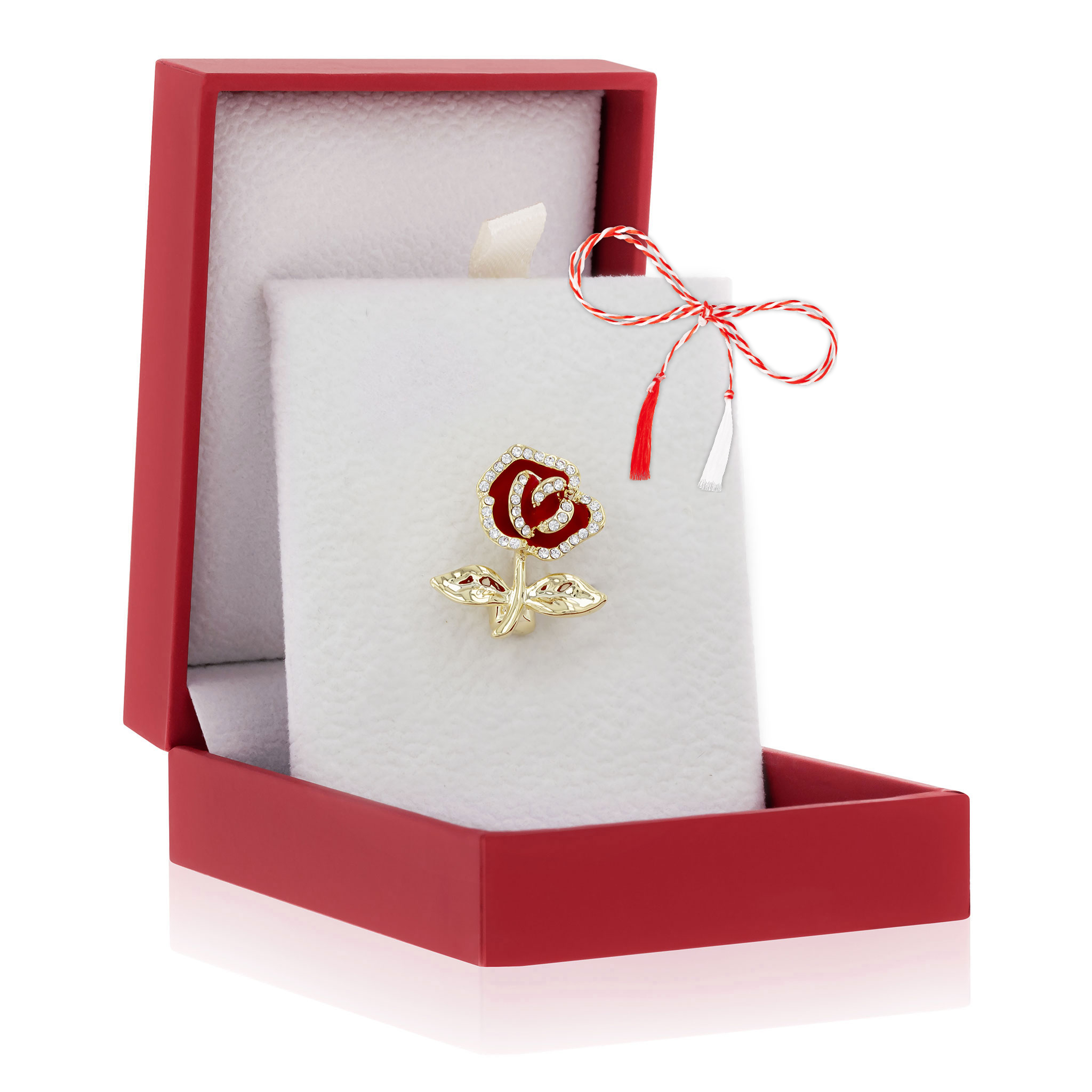 - Broșă Premium Gold Plated Trandafir cu Frunzulițe, șnur Marțișor alb-roșu, ambalată pe suport pentru broșă și casetă, însoțită de pungă cadou și plic roșu pentru mesaj, pregătită cu grijă astfel încât să devină un cadou memorabil.