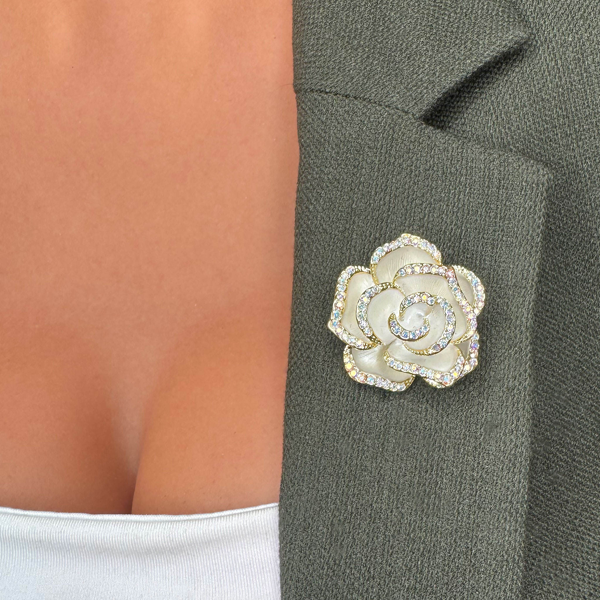 Această broșă în formă de trandafir cu pietricele este un simbol al eleganței și al frumuseții clasice, fiind o reprezentare strălucitoare a rafinamentului natural.