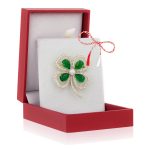 - Broșă Premium Gold Plated Trifoi cu Pietre Verzi, șnur Marțișor alb-roșu, ambalată pe suport pentru broșă și casetă, însoțită de pungă cadou și plic roșu pentru mesaj, pregătită cu grijă astfel încât să devină un cadou memorabil.