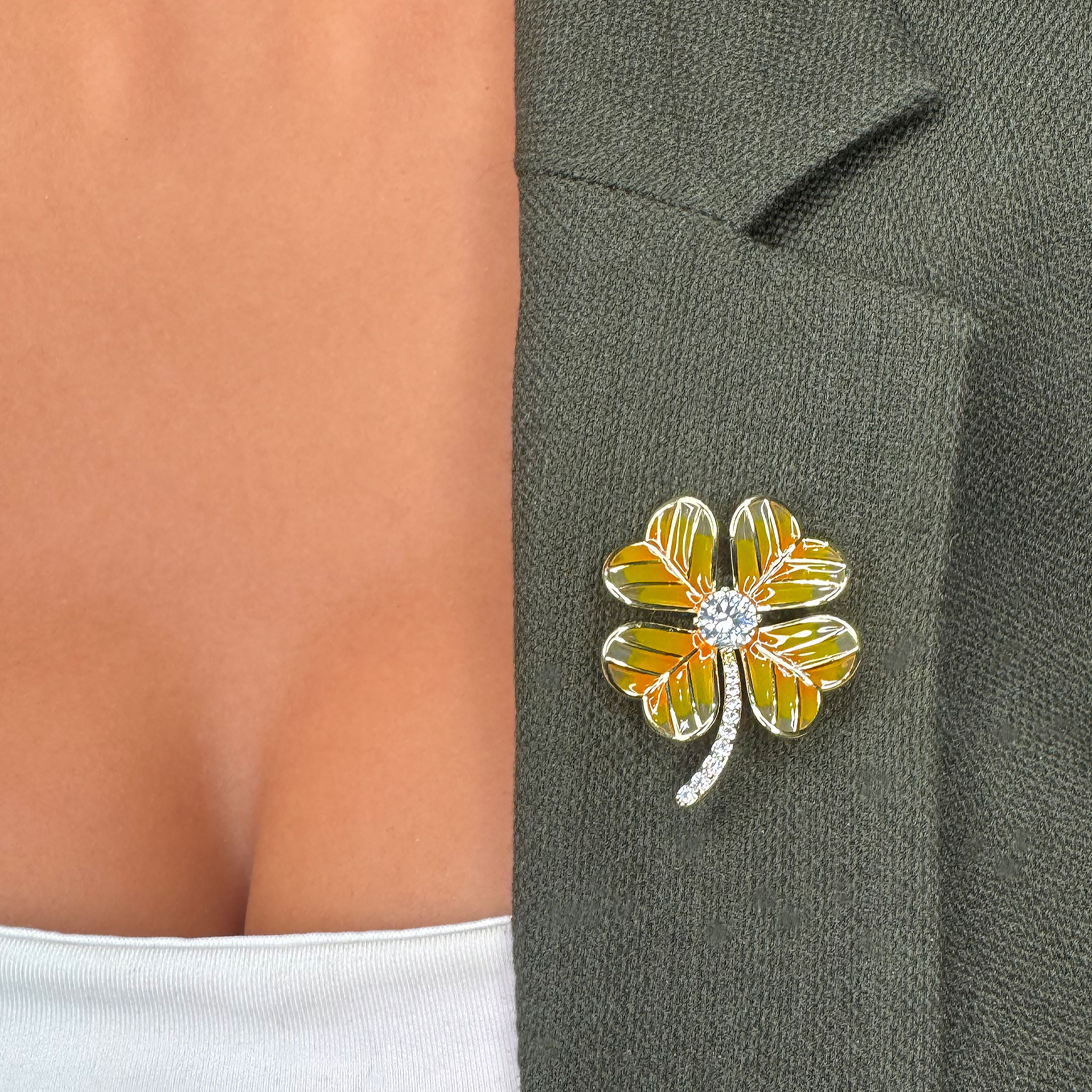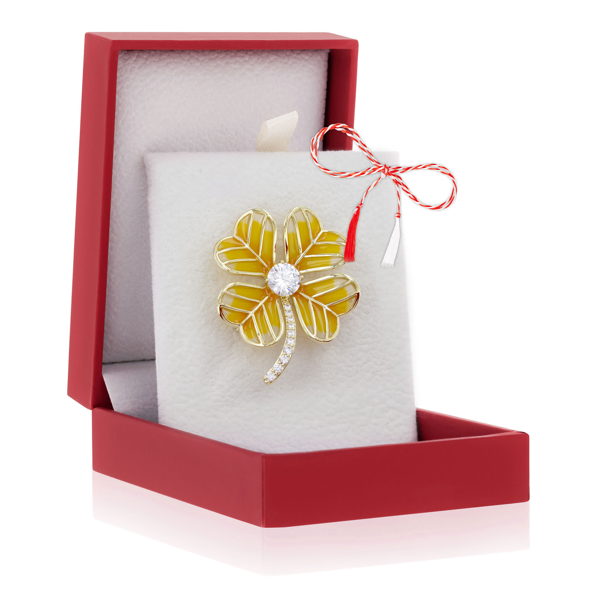 Această broșă în formă de trifoi galben este o bijuterie delicată și plină de semnificație, simbolizând norocul, prosperitatea și armonia. Designul său simplu și elegant o face o alegere perfectă pentru a celebra tradiția și natura.