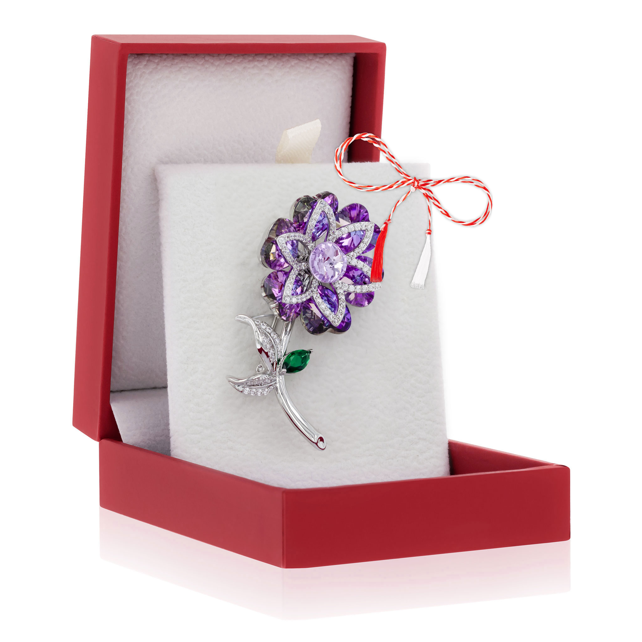 - Broșă Premium White Palladium Floare Prețioasă Mov, șnur Marțișor alb-roșu, ambalată pe suport pentru broșă și casetă, însoțită de pungă cadou și plic roșu pentru mesaj, pregătită cu grijă astfel încât să devină un cadou memorabil.