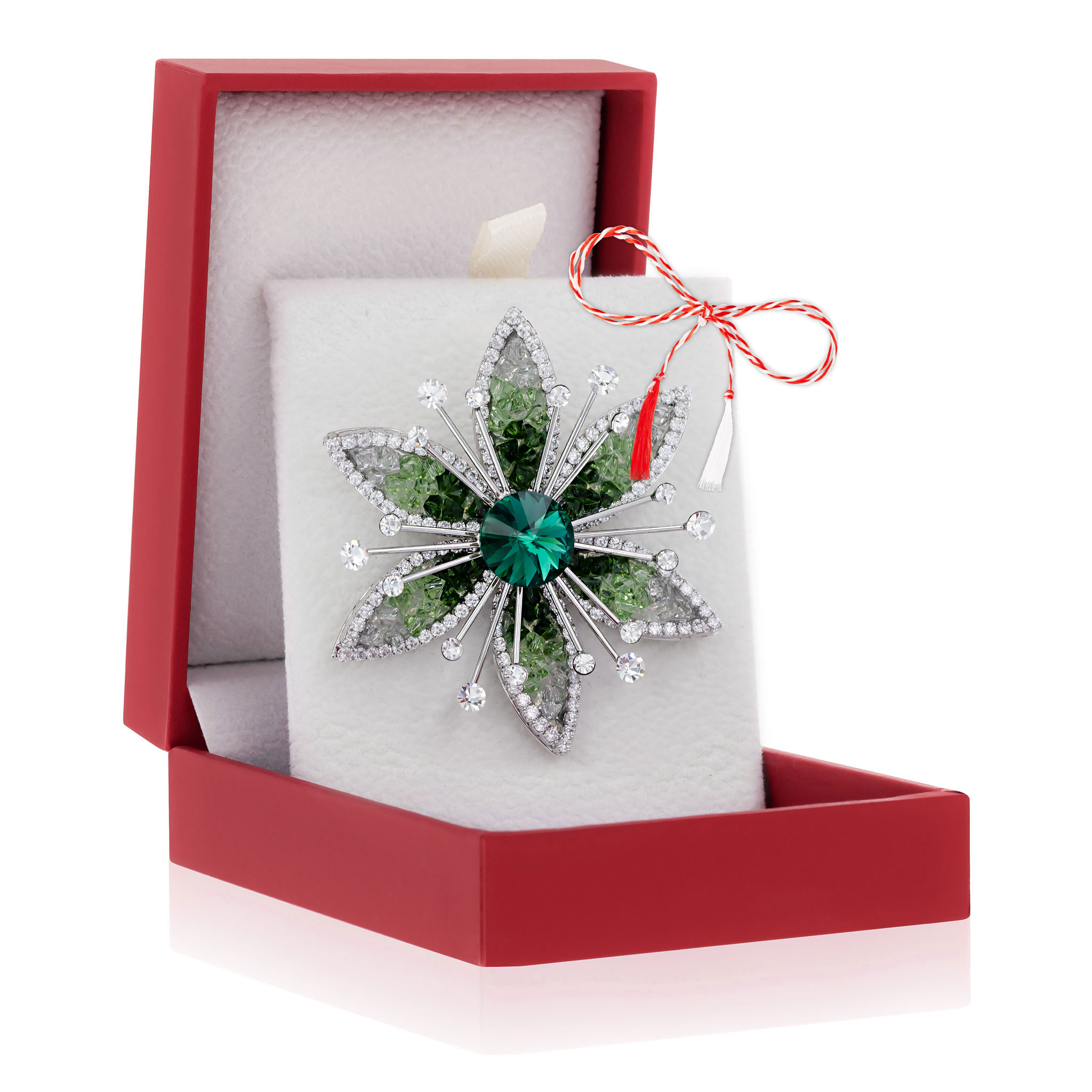 - Broșă Premium White Palladium Floare Regală Verde, șnur Marțișor alb-roșu, ambalată pe suport pentru broșă și casetă, însoțită de pungă cadou și plic roșu pentru mesaj, pregătită cu grijă astfel încât să devină un cadou memorabil.