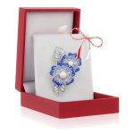 - Broșă PREMIUM White Plated Palladium – Model Flori cu Pietricele Albastre, șnur Marțișor alb-roșu, ambalată pe suport pentru broșă și casetă, pregătită cu grijă astfel încât să devină un cadou memorabil.