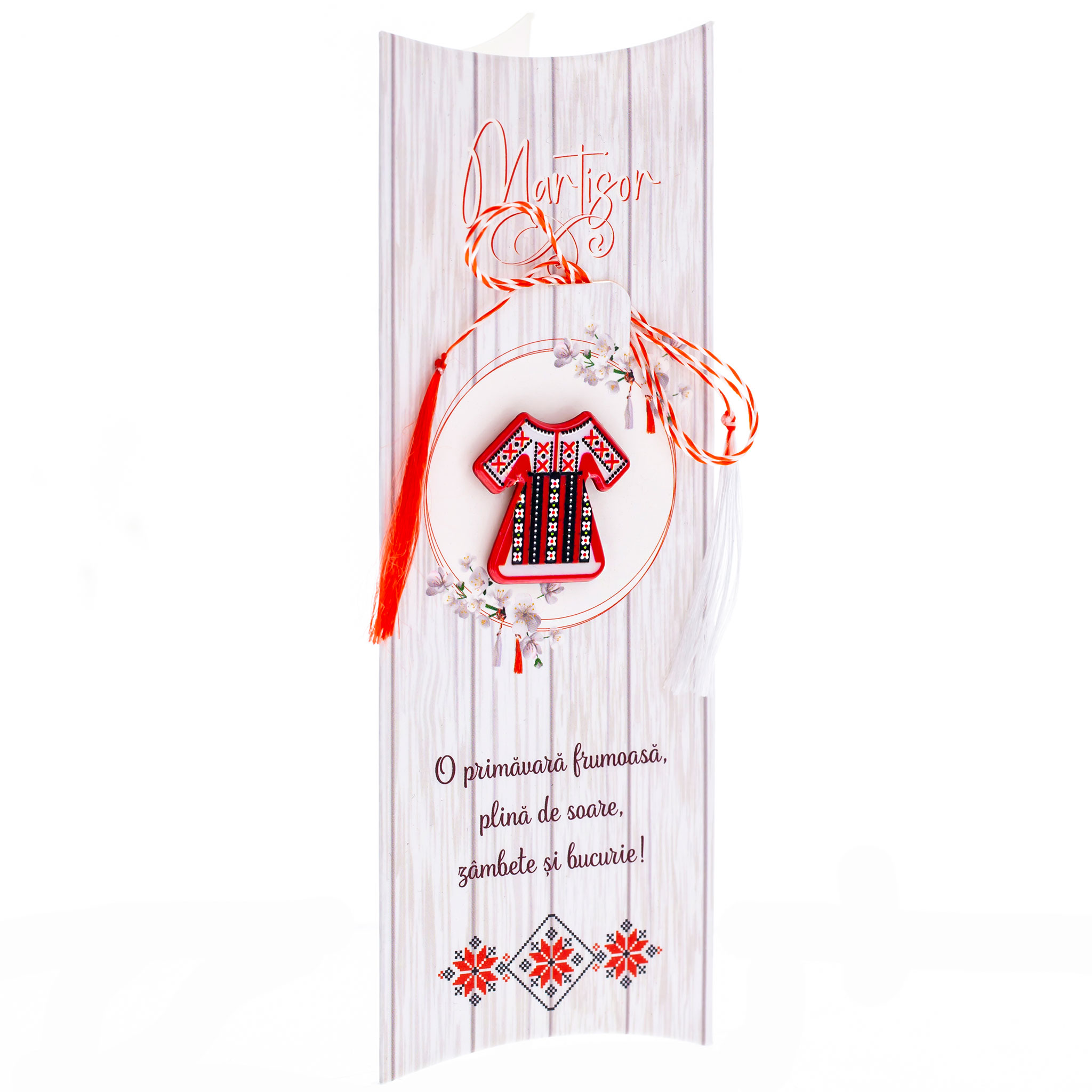 - Broșă Mărțișor rochiță cu motive tradiționale, șnur Marțișor alb-roșu, ambalată pe suport de carton tip felicitare cu mesaj de primăvară, pregătită cu grijă pentru a fi oferită ca un cadou special, simbol al tradiției.
