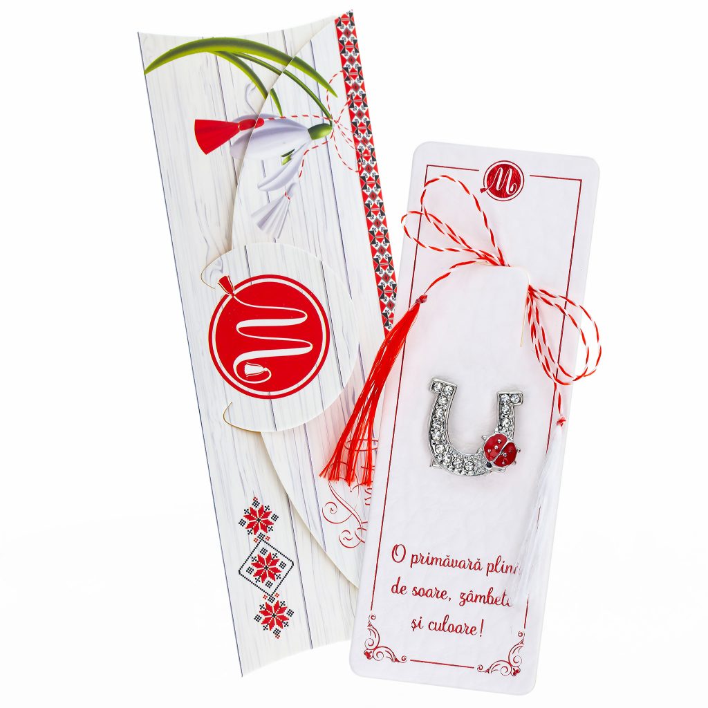 - Broșă Mărțișor Zalia Potcoavă cu Gărgăriță , șnur Marțișor alb-roșu, însoțită de suport pentru broșă și plic, pregătită cu grijă pentru a fi oferită ca un cadou special, simbol al tradiției.