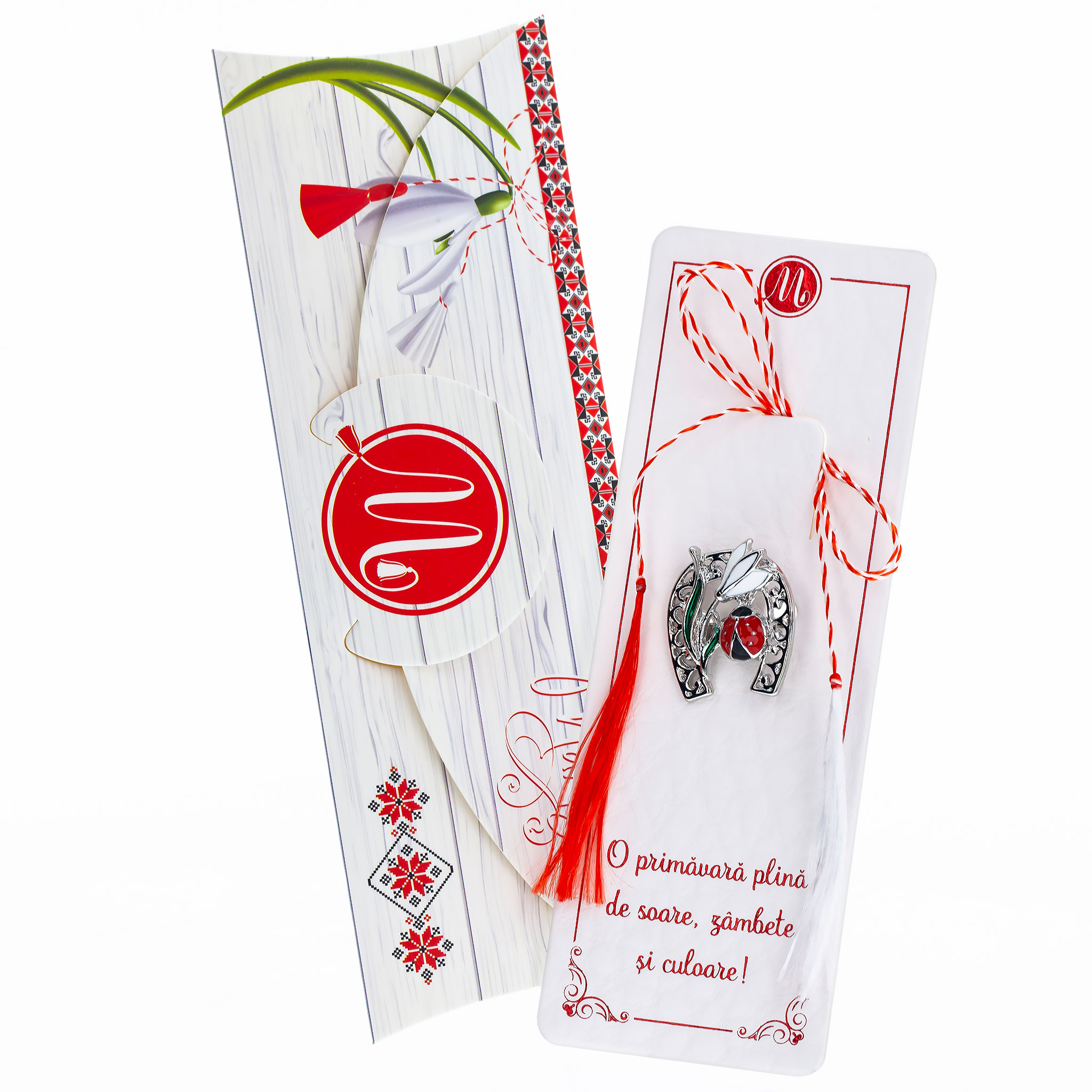 - Broșă Mărțișor Zalia Potcoavă cu Ghiocel și Gărgăriță, șnur Marțișor alb-roșu, însoțită de suport pentru broșă și plic, pregătită cu grijă pentru a fi oferită ca un cadou special, simbol al tradiției.